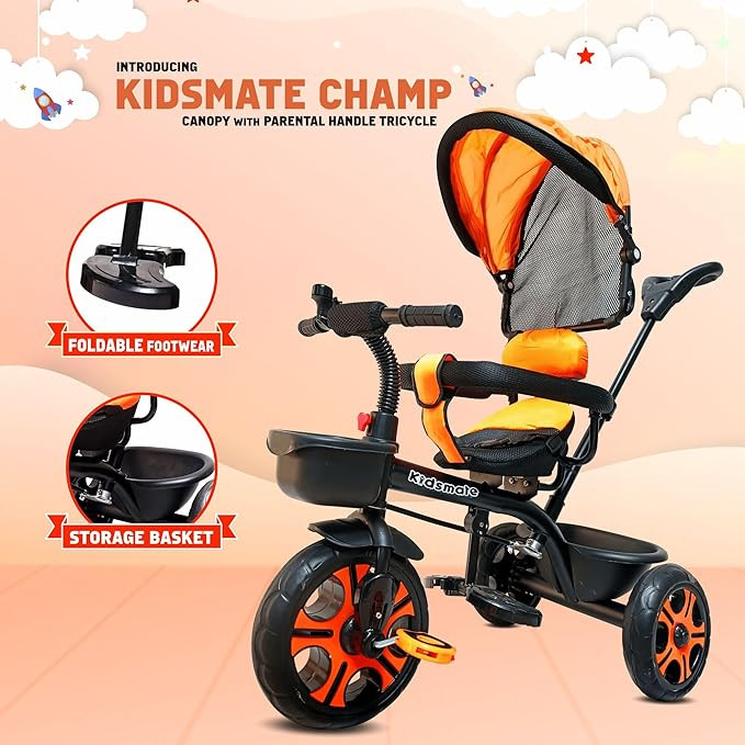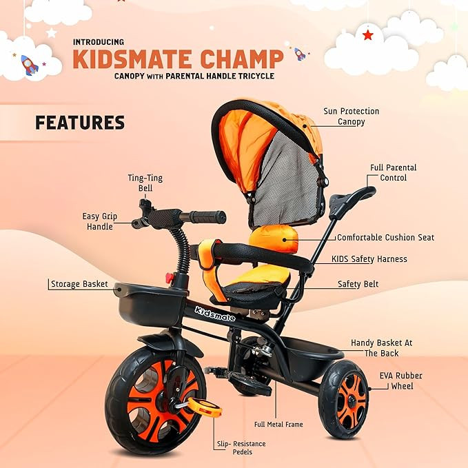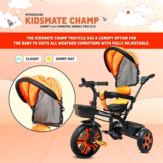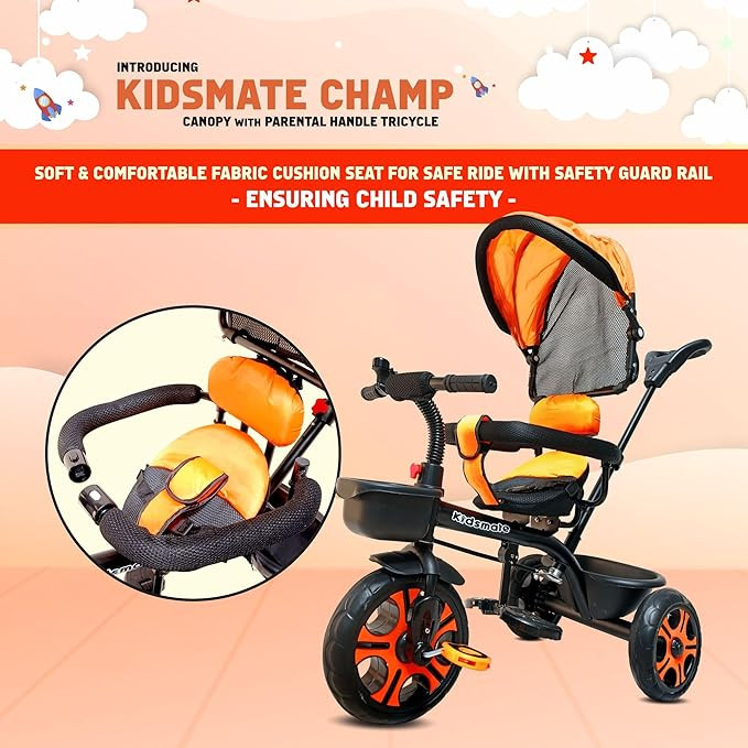 Kidsmate Champ Tricycle with Canopy Plug N Play Kids/Baby Tricycle with Safety Guard Rail and Parental Control | Fabric Cushion Seat & Bell for 12 Months to 48 Months Boys/Girls (Black_Orange)