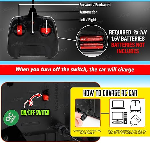 • C-Type Rechargeble: In-built Lithium battery; Use the cable provided to recharge; All Terrain: Off Roading tyres and smooth suspension