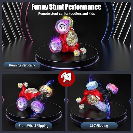 360° Rotating R/C Stunt Car: Double sides running, moving forward, backward, turning left, right, 360 degree tumbling flip for different playing experience on this electric remote control stunt car. You can control the RC cars for kids in any direction with its remote controller. This remote control car can race, and, perform double-sided driving, 360° spins and flip with its LED dazzling headlights.