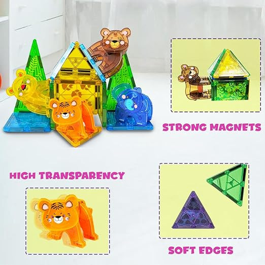 ANIMAL KINGDOM ADVENTURES - Introduce children to jungle wildlife with magnetic animal tiles, including a tiger, leopard, bear, and elephant. Spark curiosity about animals and nature while building structures.